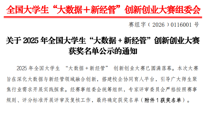 关于2025年全国大学生“大数据+新经管”创新创业大赛获奖名单公布的通知